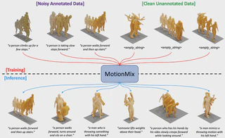Controllable generation of 3D human motions becomes an important topic as the world embraces digital transformation. Existing works, though making promising progress with the advent of diffusion models, heavily rely on meticulously captured and annotated (e.g., text) high-quality motion corpus, a resource-intensive endeavor in the real world. This motivates our proposed MotionMix, a simple yet effective weakly-supervised diffusion model that leverages both noisy and unannotated motion sequences. Specifically, we separate the denoising objectives of a diffusion model into two stages: obtaining conditional rough motion approximations in the initial T−T∗ steps by learning the noisy annotated motions, followed by the unconditional refinement of these preliminary motions during the last T∗ steps using unannotated motions. Notably, though learning from two sources of imperfect data, our model does not compromise motion generation quality compared to fully supervised approaches that access gold data. Extensive experiments on several benchmarks demonstrate that our MotionMix, as a versatile framework, consistently achieves state-of-the-art performances on text-to-motion, action-to-motion, and music-to-dance tasks.